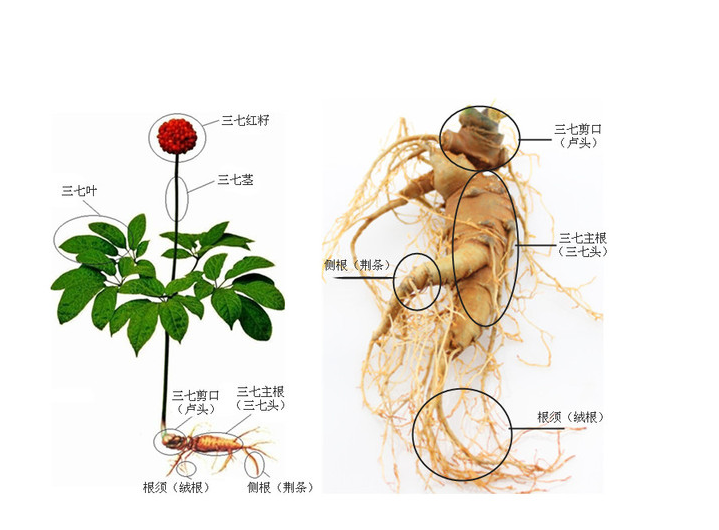 芦头:位于主根和地上茎之间,剪口的三七总皂甙含量是三七地下部分最高的部位,一般在10%~12%左右。主要用于医药提取三七总皂苷,一般不做食用。这个部位因为太高了,所以反而不利于人体吸收,再者三七芦头有害物质残留集中的地方,也不建议食用。